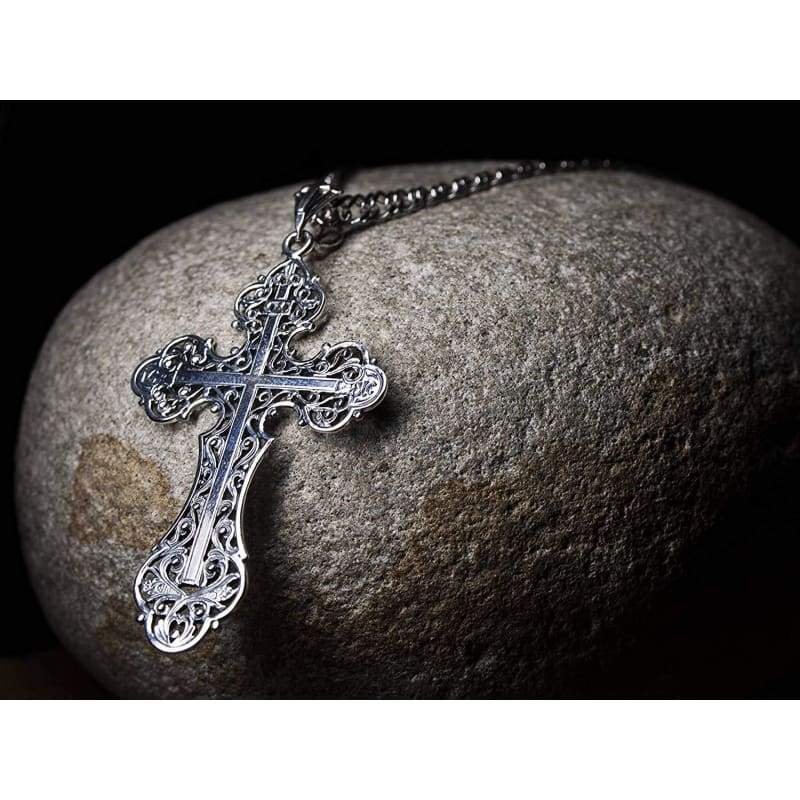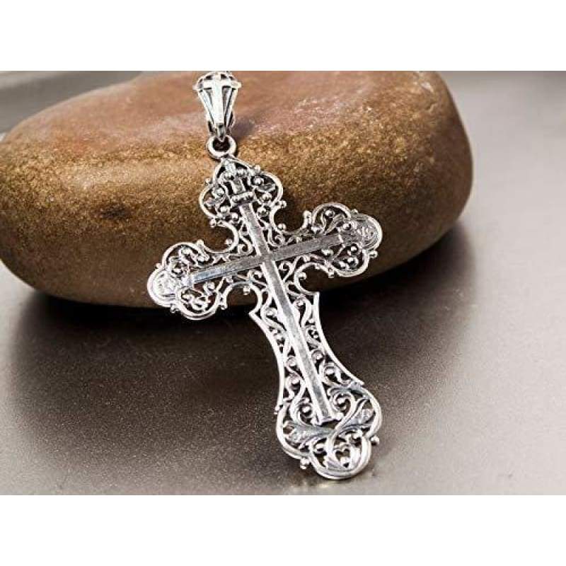 Large Christian Cross 925 Sterling Silver Necklace for Men Women Bible Verse Double Sided Filigree Crosses Pendant with Lords Prayer Religious Jewelry/Handmade