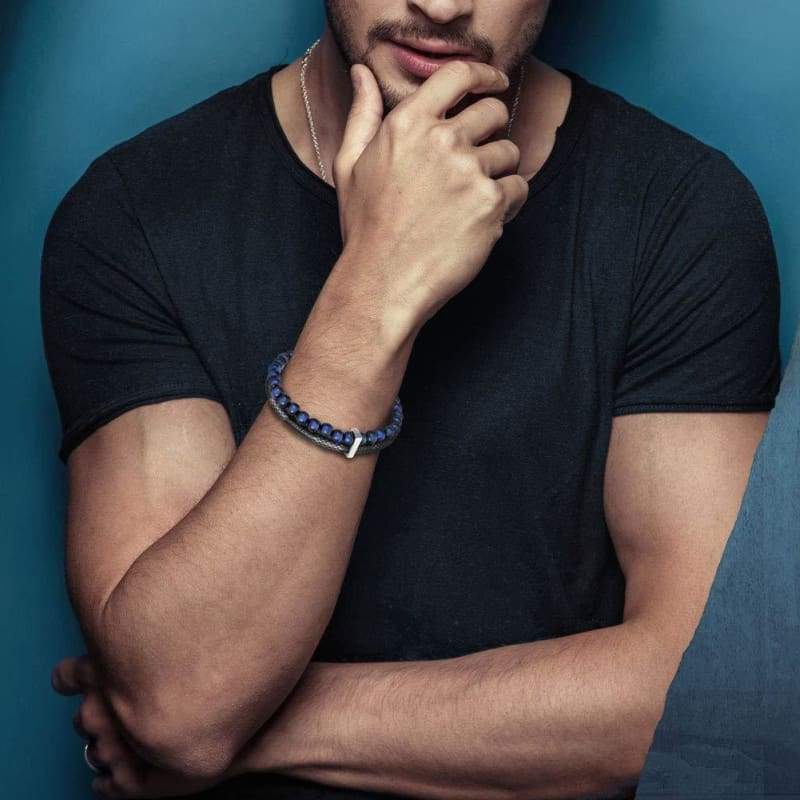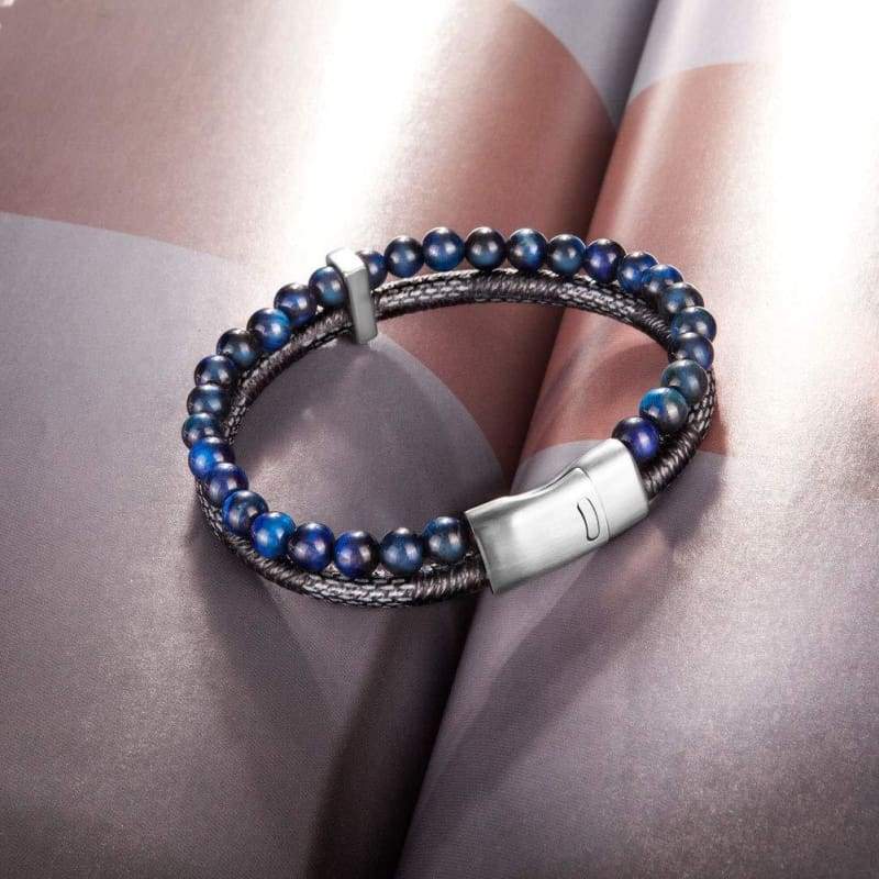 murtoo Mens Bead Leather Bracelet Blue and Brown Bead and Leather Bracelet for Men (blue-silver) - Apparel