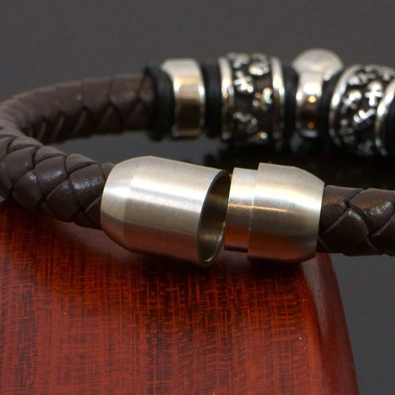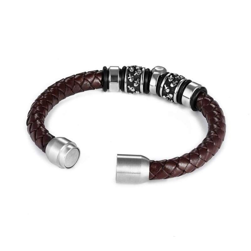 Details: Featuring a braided genuine-leather design, this men's bracelet will be your go-to accessory matches any style of your outfit. The braided leather design and a stainless steel clasp give this bracelet a timeless look. Length: 8.0 in. Width: 12mm Safety Clasp Nickel free