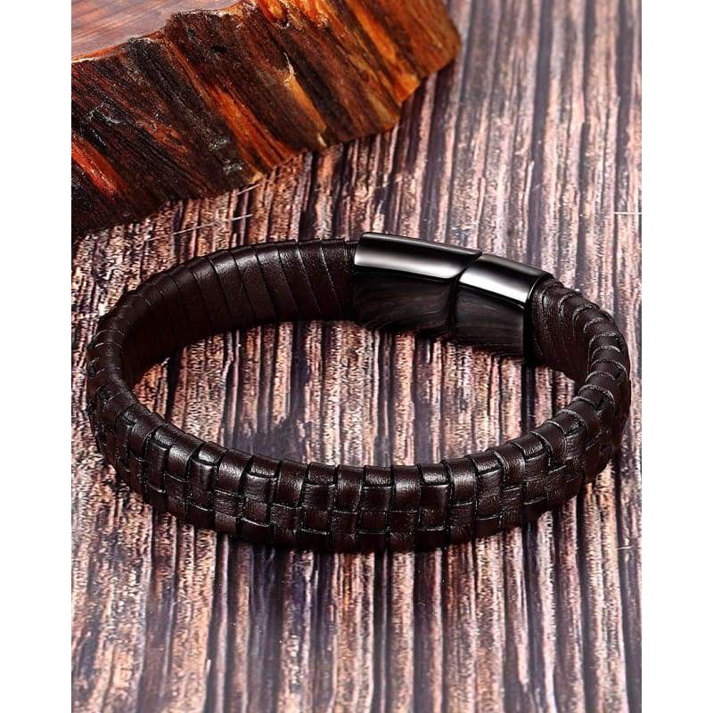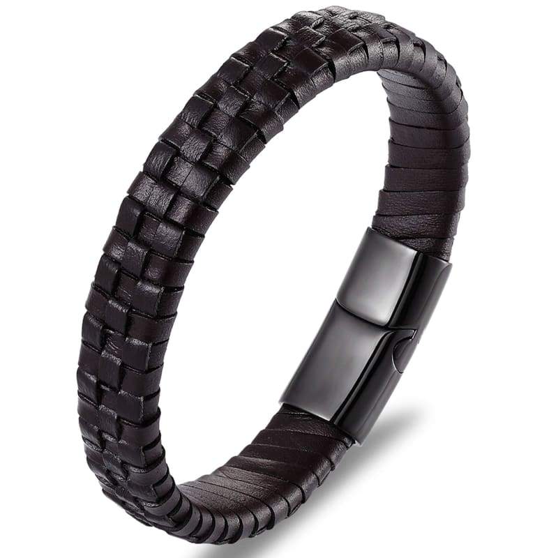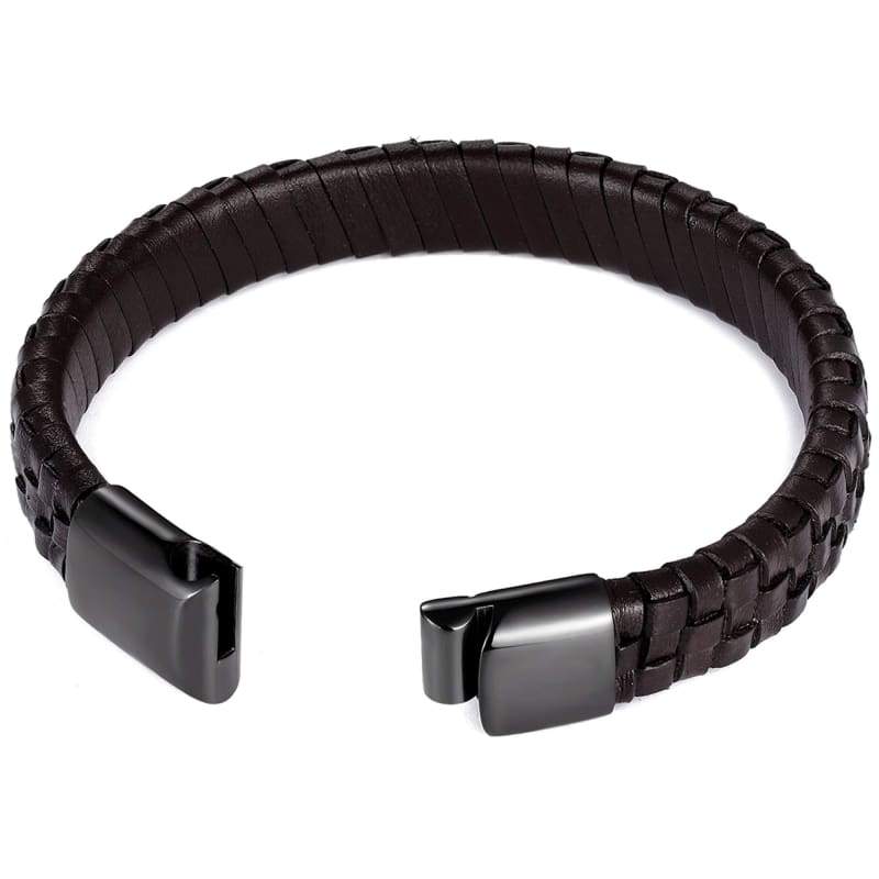 Details: Featuring a braided genuine-leather design, this men's bracelet will be your go-to accessory matches any style of your outfit. The braided leather design and a stainless steel clasp give this bracelet a timeless look. Length: 8.0 in. Width: 12mm Safety Clasp Nickel free